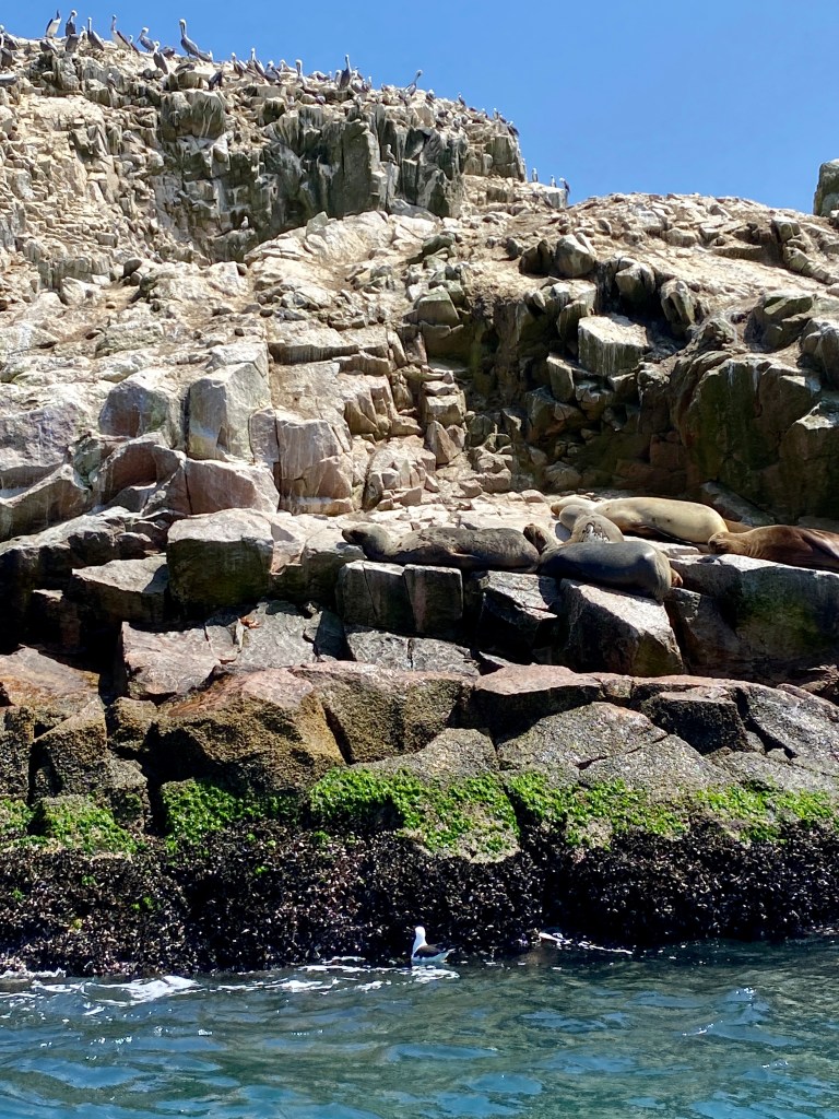 Then we went on to the last stop which was a sunken boat. The tour guide told us a story about when a tsunami hit Paracas in the past and crashed over the town. I have seen signs for tsunamis around the beaches. They had one just in Jan 2022 that apparently the Navy didn’t give them appropriate warnings for and two women drowned because their bus they were in parked at the beach got dragged into the ocean with the waves. Scary. So this crashed boat houses more big sea lions, turkey vultures and birds.